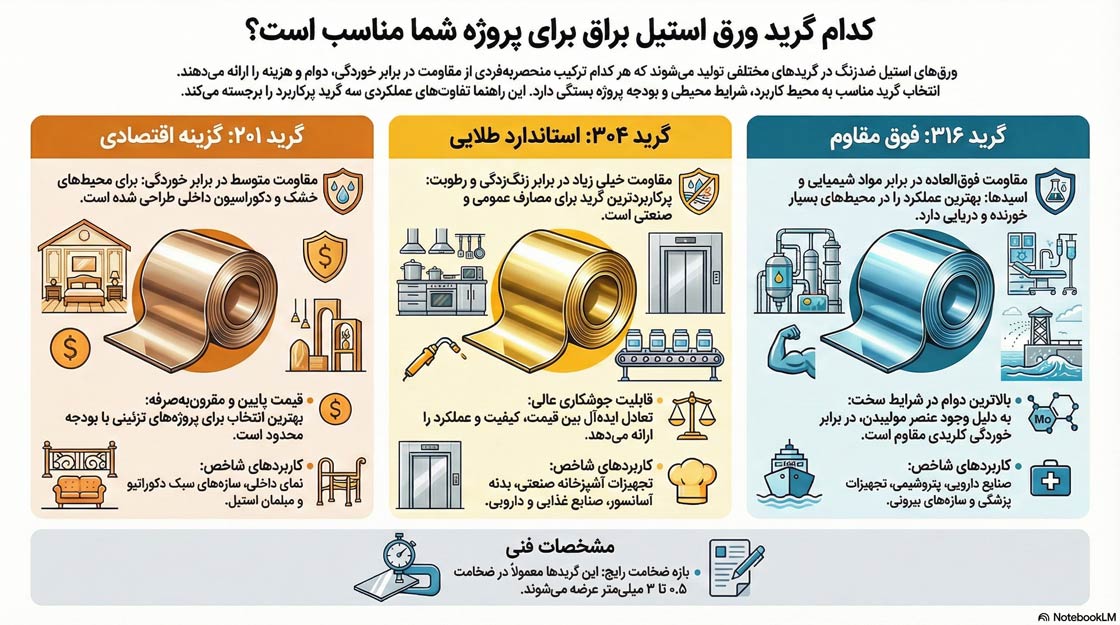 شناخت تفاوتهای ساختاری میان گریدهای مختلف به شما کمک میکند تا هوشمندانهترین انتخاب را متناسب با بودجه و نیاز فنی خود داشته باشید. در استیلسرا، این ورقها در چهار دستهبندی اصلی عرضه میشوند: