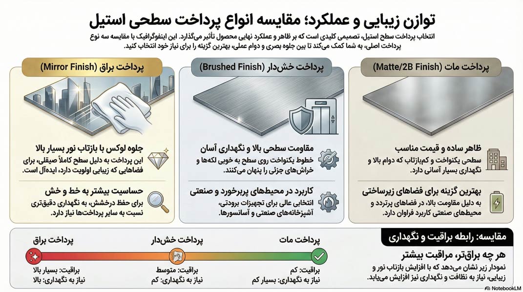 در مقابل، ورقهای مات و ورق استیل خشدار برای محیطهایی طراحی شدهاند که «عملکرد» حرف اول را میزند.